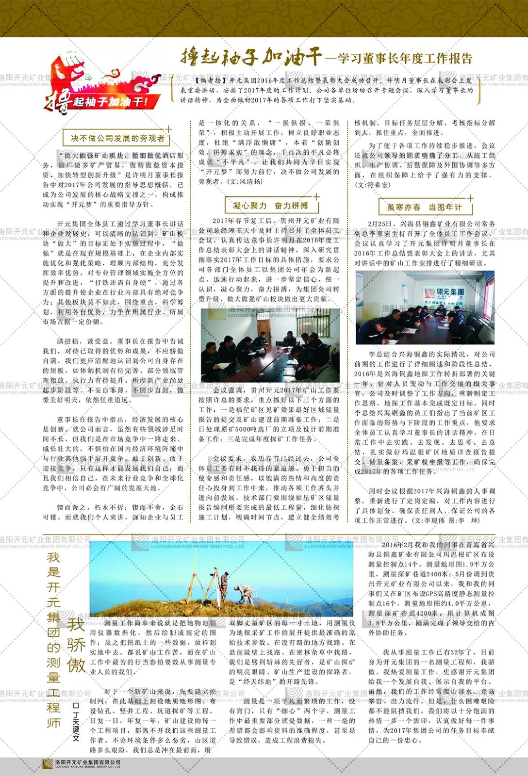 洛陽(yáng)開元礦業(yè)集團(tuán)有限公司簡(jiǎn)介洛陽(yáng)開元礦業(yè)集團(tuán)有限公司,始成立于2006年,位于洛陽(yáng)市開元大道269號(hào)。集團(tuán)旗下共有十余家全資子公司,業(yè)務(wù)涉及有色金屬礦山開發(fā)、礦產(chǎn)品購(gòu)銷與進(jìn)出口貿(mào)易、房地產(chǎn)開發(fā)、文化藝術(shù)、企業(yè)管理與咨詢、資本投資等多個(gè)領(lǐng)域。2024年,集團(tuán)公司銷售總額達(dá)7.8億元。民建河南省委委員、民建河南省委企業(yè)委副主任、民建洛陽(yáng)市委委員、企業(yè)委主任、洛陽(yáng)民建企業(yè)家協(xié)會(huì)會(huì)長(zhǎng)許明月是公司創(chuàng)始人,現(xiàn)任洛陽(yáng)開元礦業(yè)集團(tuán)有限公司董事長(zhǎng)。在礦業(yè)領(lǐng)域,洛陽(yáng)開元礦業(yè)集團(tuán)擁有多家實(shí)力雄厚的子公司:貴州開元礦業(yè)有限公司探、采礦權(quán)面積共11.33平方公里;興??h銅鑫礦業(yè)有限公司探礦權(quán)面積8.76平方公里,礦山資源潛力巨大;2021年,開元集團(tuán)與盧氏中科礦業(yè)有限公司開展戰(zhàn)略合作。盧氏中科礦業(yè)有限公司專注于有色金屬的浮選、加工和銷售,擁有強(qiáng)大的技術(shù)支撐平臺(tái),是集探、采、選、冶、研為一體的中大型綜合礦業(yè)企業(yè)。目前,盧氏中科王家河1000噸選礦廠已成功投產(chǎn),雙河金礦、柳關(guān)欒盧鉛鋅礦相繼順利開工,樓房銀礦與圪老灣鉛鋅礦的深部探礦重大突破,標(biāo)志著礦山版圖取得重大進(jìn)展,為開元集團(tuán)后續(xù)發(fā)展奠定了堅(jiān)實(shí)基礎(chǔ)。在文化傳媒領(lǐng)域,洛陽(yáng)市明月美術(shù)館通過(guò)豐富多樣的藝術(shù)展覽、學(xué)術(shù)研討和公共教育活動(dòng),努力打造一個(gè)集展覽、交流、教育、研究為一體的綜合性藝術(shù)平臺(tái)。此外,在金融投資領(lǐng)域,開元集團(tuán)旗下的北京明峰資本管理有限公司專注于投資具有高增長(zhǎng)潛力的優(yōu)秀企業(yè),特別是高科技、新能源、環(huán)保等新興產(chǎn)業(yè),為客戶提供個(gè)性化的資產(chǎn)配置服務(wù)。在做好企業(yè)經(jīng)營(yíng)的同時(shí),開元集團(tuán)始終不忘企業(yè)的社會(huì)責(zé)任和家國(guó)情懷,以突出的愛(ài)心公益事跡,開展了一系列公益慈善活動(dòng):“民建林”公益事業(yè)通過(guò)“思源基金”“幫幫公益”線上公益平臺(tái),與眾多愛(ài)心人士籌措資金20余萬(wàn)元;資助541名貧困大學(xué)生共計(jì)270余萬(wàn)元,推進(jìn)“數(shù)字助力——河南AI人才培養(yǎng)”;捐款10萬(wàn)元,馳援京津冀、黑龍江洪水地質(zhì)災(zāi)害……公司于2017年底被洛陽(yáng)市慈善總會(huì)評(píng)為“洛陽(yáng)慈善風(fēng)云榜——十大愛(ài)心集體”。洛陽(yáng)開元礦業(yè)集團(tuán)有限公司秉承持續(xù)發(fā)展理念,憑借多年來(lái)良好的企業(yè)信譽(yù)與經(jīng)營(yíng)業(yè)績(jī),與全國(guó)多家企業(yè)建立了良好合作關(guān)系,受到社會(huì)各界的一致好評(píng),多次榮獲“納稅標(biāo)兵”“先進(jìn)企業(yè)”“招商引資模范企業(yè)”等榮譽(yù)稱號(hào)?;赝麃?lái)時(shí)路,開元人勠力同心,以“闖”的精神和“創(chuàng)”的勁頭,一路披荊斬棘,踏過(guò)千山萬(wàn)水;展望新未來(lái),開元人凝心聚力,不執(zhí)于“舊”,無(wú)畏于“新”,秉承“勇于跨越,追求卓越”的企業(yè)精神,乘著國(guó)家高質(zhì)量發(fā)展新征程的東風(fēng),跨過(guò)高山,越過(guò)大海,向著集團(tuán)多元化、國(guó)際化的目標(biāo),逐夢(mèng)遠(yuǎn)航,跨越前行!