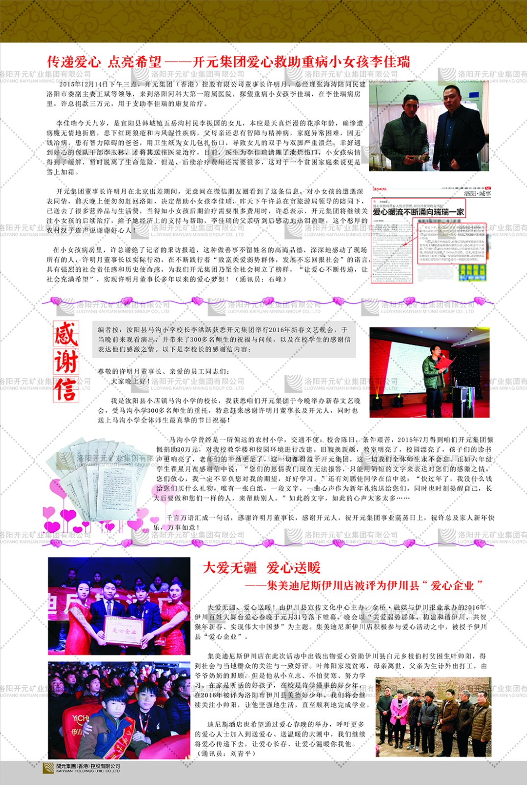 洛陽開元礦業(yè)集團(tuán)有限公司簡介洛陽開元礦業(yè)集團(tuán)有限公司,始成立于2006年,位于洛陽市開元大道269號(hào)。集團(tuán)旗下共有十余家全資子公司,業(yè)務(wù)涉及有色金屬礦山開發(fā)、礦產(chǎn)品購銷與進(jìn)出口貿(mào)易、房地產(chǎn)開發(fā)、文化藝術(shù)、企業(yè)管理與咨詢、資本投資等多個(gè)領(lǐng)域。2024年,集團(tuán)公司銷售總額達(dá)7.8億元。民建河南省委委員、民建河南省委企業(yè)委副主任、民建洛陽市委委員、企業(yè)委主任、洛陽民建企業(yè)家協(xié)會(huì)會(huì)長許明月是公司創(chuàng)始人,現(xiàn)任洛陽開元礦業(yè)集團(tuán)有限公司董事長。在礦業(yè)領(lǐng)域,洛陽開元礦業(yè)集團(tuán)擁有多家實(shí)力雄厚的子公司:貴州開元礦業(yè)有限公司探、采礦權(quán)面積共11.33平方公里;興海縣銅鑫礦業(yè)有限公司探礦權(quán)面積8.76平方公里,礦山資源潛力巨大;2021年,開元集團(tuán)與盧氏中科礦業(yè)有限公司開展戰(zhàn)略合作。盧氏中科礦業(yè)有限公司專注于有色金屬的浮選、加工和銷售,擁有強(qiáng)大的技術(shù)支撐平臺(tái),是集探、采、選、冶、研為一體的中大型綜合礦業(yè)企業(yè)。目前,盧氏中科王家河1000噸選礦廠已成功投產(chǎn),雙河金礦、柳關(guān)欒盧鉛鋅礦相繼順利開工,樓房銀礦與圪老灣鉛鋅礦的深部探礦重大突破,標(biāo)志著礦山版圖取得重大進(jìn)展,為開元集團(tuán)后續(xù)發(fā)展奠定了堅(jiān)實(shí)基礎(chǔ)。在文化傳媒領(lǐng)域,洛陽市明月美術(shù)館通過豐富多樣的藝術(shù)展覽、學(xué)術(shù)研討和公共教育活動(dòng),努力打造一個(gè)集展覽、交流、教育、研究為一體的綜合性藝術(shù)平臺(tái)。此外,在金融投資領(lǐng)域,開元集團(tuán)旗下的北京明峰資本管理有限公司專注于投資具有高增長潛力的優(yōu)秀企業(yè),特別是高科技、新能源、環(huán)保等新興產(chǎn)業(yè),為客戶提供個(gè)性化的資產(chǎn)配置服務(wù)。在做好企業(yè)經(jīng)營的同時(shí),開元集團(tuán)始終不忘企業(yè)的社會(huì)責(zé)任和家國情懷,以突出的愛心公益事跡,開展了一系列公益慈善活動(dòng):“民建林”公益事業(yè)通過“思源基金”“幫幫公益”線上公益平臺(tái),與眾多愛心人士籌措資金20余萬元;資助541名貧困大學(xué)生共計(jì)270余萬元,推進(jìn)“數(shù)字助力——河南AI人才培養(yǎng)”;捐款10萬元,馳援京津冀、黑龍江洪水地質(zhì)災(zāi)害……公司于2017年底被洛陽市慈善總會(huì)評為“洛陽慈善風(fēng)云榜——十大愛心集體”。洛陽開元礦業(yè)集團(tuán)有限公司秉承持續(xù)發(fā)展理念,憑借多年來良好的企業(yè)信譽(yù)與經(jīng)營業(yè)績,與全國多家企業(yè)建立了良好合作關(guān)系,受到社會(huì)各界的一致好評,多次榮獲“納稅標(biāo)兵”“先進(jìn)企業(yè)”“招商引資模范企業(yè)”等榮譽(yù)稱號(hào)?;赝麃頃r(shí)路,開元人勠力同心,以“闖”的精神和“創(chuàng)”的勁頭,一路披荊斬棘,踏過千山萬水;展望新未來,開元人凝心聚力,不執(zhí)于“舊”,無畏于“新”,秉承“勇于跨越,追求卓越”的企業(yè)精神,乘著國家高質(zhì)量發(fā)展新征程的東風(fēng),跨過高山,越過大海,向著集團(tuán)多元化、國際化的目標(biāo),逐夢遠(yuǎn)航,跨越前行!