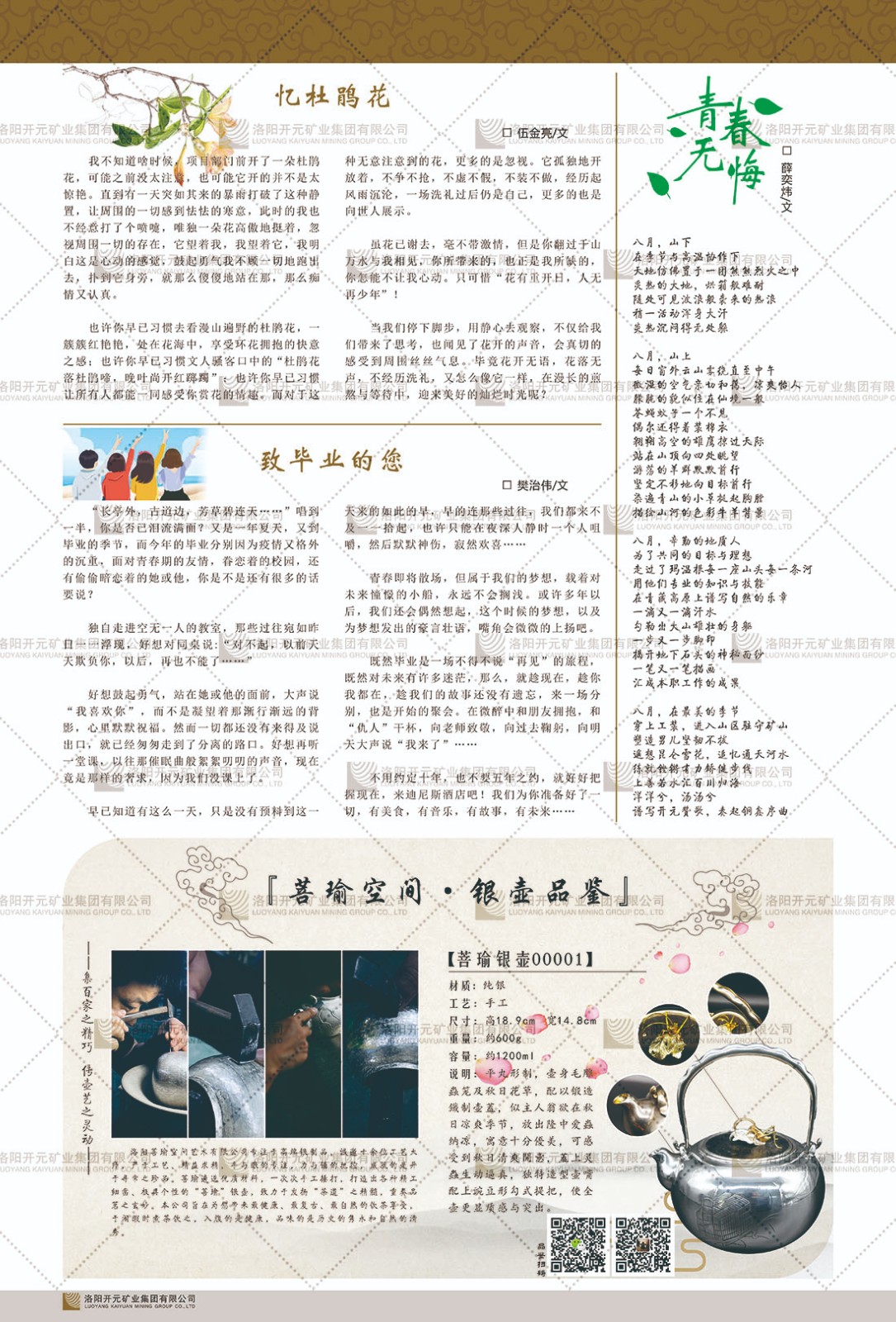 洛陽開元礦業(yè)集團(tuán)有限公司簡介洛陽開元礦業(yè)集團(tuán)有限公司,始成立于2006年,位于洛陽市開元大道269號(hào)。集團(tuán)旗下共有十余家全資子公司,業(yè)務(wù)涉及有色金屬礦山開發(fā)、礦產(chǎn)品購銷與進(jìn)出口貿(mào)易、房地產(chǎn)開發(fā)、文化藝術(shù)、企業(yè)管理與咨詢、資本投資等多個(gè)領(lǐng)域。2024年,集團(tuán)公司銷售總額達(dá)7.8億元。民建河南省委委員、民建河南省委企業(yè)委副主任、民建洛陽市委委員、企業(yè)委主任、洛陽民建企業(yè)家協(xié)會(huì)會(huì)長許明月是公司創(chuàng)始人,現(xiàn)任洛陽開元礦業(yè)集團(tuán)有限公司董事長。在礦業(yè)領(lǐng)域,洛陽開元礦業(yè)集團(tuán)擁有多家實(shí)力雄厚的子公司:貴州開元礦業(yè)有限公司探、采礦權(quán)面積共11.33平方公里;興??h銅鑫礦業(yè)有限公司探礦權(quán)面積8.76平方公里,礦山資源潛力巨大;2021年,開元集團(tuán)與盧氏中科礦業(yè)有限公司開展戰(zhàn)略合作。盧氏中科礦業(yè)有限公司專注于有色金屬的浮選、加工和銷售,擁有強(qiáng)大的技術(shù)支撐平臺(tái),是集探、采、選、冶、研為一體的中大型綜合礦業(yè)企業(yè)。目前,盧氏中科王家河1000噸選礦廠已成功投產(chǎn),雙河金礦、柳關(guān)欒盧鉛鋅礦相繼順利開工,樓房銀礦與圪老灣鉛鋅礦的深部探礦重大突破,標(biāo)志著礦山版圖取得重大進(jìn)展,為開元集團(tuán)后續(xù)發(fā)展奠定了堅(jiān)實(shí)基礎(chǔ)。在文化傳媒領(lǐng)域,洛陽市明月美術(shù)館通過豐富多樣的藝術(shù)展覽、學(xué)術(shù)研討和公共教育活動(dòng),努力打造一個(gè)集展覽、交流、教育、研究為一體的綜合性藝術(shù)平臺(tái)。此外,在金融投資領(lǐng)域,開元集團(tuán)旗下的北京明峰資本管理有限公司專注于投資具有高增長潛力的優(yōu)秀企業(yè),特別是高科技、新能源、環(huán)保等新興產(chǎn)業(yè),為客戶提供個(gè)性化的資產(chǎn)配置服務(wù)。在做好企業(yè)經(jīng)營的同時(shí),開元集團(tuán)始終不忘企業(yè)的社會(huì)責(zé)任和家國情懷,以突出的愛心公益事跡,開展了一系列公益慈善活動(dòng):“民建林”公益事業(yè)通過“思源基金”“幫幫公益”線上公益平臺(tái),與眾多愛心人士籌措資金20余萬元;資助541名貧困大學(xué)生共計(jì)270余萬元,推進(jìn)“數(shù)字助力——河南AI人才培養(yǎng)”;捐款10萬元,馳援京津冀、黑龍江洪水地質(zhì)災(zāi)害……公司于2017年底被洛陽市慈善總會(huì)評(píng)為“洛陽慈善風(fēng)云榜——十大愛心集體”。洛陽開元礦業(yè)集團(tuán)有限公司秉承持續(xù)發(fā)展理念,憑借多年來良好的企業(yè)信譽(yù)與經(jīng)營業(yè)績,與全國多家企業(yè)建立了良好合作關(guān)系,受到社會(huì)各界的一致好評(píng),多次榮獲“納稅標(biāo)兵”“先進(jìn)企業(yè)”“招商引資模范企業(yè)”等榮譽(yù)稱號(hào)。回望來時(shí)路,開元人勠力同心,以“闖”的精神和“創(chuàng)”的勁頭,一路披荊斬棘,踏過千山萬水;展望新未來,開元人凝心聚力,不執(zhí)于“舊”,無畏于“新”,秉承“勇于跨越,追求卓越”的企業(yè)精神,乘著國家高質(zhì)量發(fā)展新征程的東風(fēng),跨過高山,越過大海,向著集團(tuán)多元化、國際化的目標(biāo),逐夢遠(yuǎn)航,跨越前行!