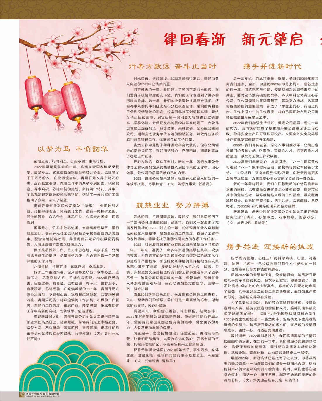 洛陽開元礦業(yè)集團(tuán)有限公司簡介洛陽開元礦業(yè)集團(tuán)有限公司,始成立于2006年,位于洛陽市開元大道269號。集團(tuán)旗下共有十余家全資子公司,業(yè)務(wù)涉及有色金屬礦山開發(fā)、礦產(chǎn)品購銷與進(jìn)出口貿(mào)易、房地產(chǎn)開發(fā)、文化藝術(shù)、企業(yè)管理與咨詢、資本投資等多個領(lǐng)域。2024年,集團(tuán)公司銷售總額達(dá)7.8億元。民建河南省委委員、民建河南省委企業(yè)委副主任、民建洛陽市委委員、企業(yè)委主任、洛陽民建企業(yè)家協(xié)會會長許明月是公司創(chuàng)始人,現(xiàn)任洛陽開元礦業(yè)集團(tuán)有限公司董事長。在礦業(yè)領(lǐng)域,洛陽開元礦業(yè)集團(tuán)擁有多家實力雄厚的子公司:貴州開元礦業(yè)有限公司探、采礦權(quán)面積共11.33平方公里;興海縣銅鑫礦業(yè)有限公司探礦權(quán)面積8.76平方公里,礦山資源潛力巨大;2021年,開元集團(tuán)與盧氏中科礦業(yè)有限公司開展戰(zhàn)略合作。盧氏中科礦業(yè)有限公司專注于有色金屬的浮選、加工和銷售,擁有強(qiáng)大的技術(shù)支撐平臺,是集探、采、選、冶、研為一體的中大型綜合礦業(yè)企業(yè)。目前,盧氏中科王家河1000噸選礦廠已成功投產(chǎn),雙河金礦、柳關(guān)欒盧鉛鋅礦相繼順利開工,樓房銀礦與圪老灣鉛鋅礦的深部探礦重大突破,標(biāo)志著礦山版圖取得重大進(jìn)展,為開元集團(tuán)后續(xù)發(fā)展奠定了堅實基礎(chǔ)。在文化傳媒領(lǐng)域,洛陽市明月美術(shù)館通過豐富多樣的藝術(shù)展覽、學(xué)術(shù)研討和公共教育活動,努力打造一個集展覽、交流、教育、研究為一體的綜合性藝術(shù)平臺。此外,在金融投資領(lǐng)域,開元集團(tuán)旗下的北京明峰資本管理有限公司專注于投資具有高增長潛力的優(yōu)秀企業(yè),特別是高科技、新能源、環(huán)保等新興產(chǎn)業(yè),為客戶提供個性化的資產(chǎn)配置服務(wù)。在做好企業(yè)經(jīng)營的同時,開元集團(tuán)始終不忘企業(yè)的社會責(zé)任和家國情懷,以突出的愛心公益事跡,開展了一系列公益慈善活動:“民建林”公益事業(yè)通過“思源基金”“幫幫公益”線上公益平臺,與眾多愛心人士籌措資金20余萬元;資助541名貧困大學(xué)生共計270余萬元,推進(jìn)“數(shù)字助力——河南AI人才培養(yǎng)”;捐款10萬元,馳援京津冀、黑龍江洪水地質(zhì)災(zāi)害……公司于2017年底被洛陽市慈善總會評為“洛陽慈善風(fēng)云榜——十大愛心集體”。洛陽開元礦業(yè)集團(tuán)有限公司秉承持續(xù)發(fā)展理念,憑借多年來良好的企業(yè)信譽(yù)與經(jīng)營業(yè)績,與全國多家企業(yè)建立了良好合作關(guān)系,受到社會各界的一致好評,多次榮獲“納稅標(biāo)兵”“先進(jìn)企業(yè)”“招商引資模范企業(yè)”等榮譽(yù)稱號?;赝麃頃r路,開元人勠力同心,以“闖”的精神和“創(chuàng)”的勁頭,一路披荊斬棘,踏過千山萬水;展望新未來,開元人凝心聚力,不執(zhí)于“舊”,無畏于“新”,秉承“勇于跨越,追求卓越”的企業(yè)精神,乘著國家高質(zhì)量發(fā)展新征程的東風(fēng),跨過高山,越過大海,向著集團(tuán)多元化、國際化的目標(biāo),逐夢遠(yuǎn)航,跨越前行!
