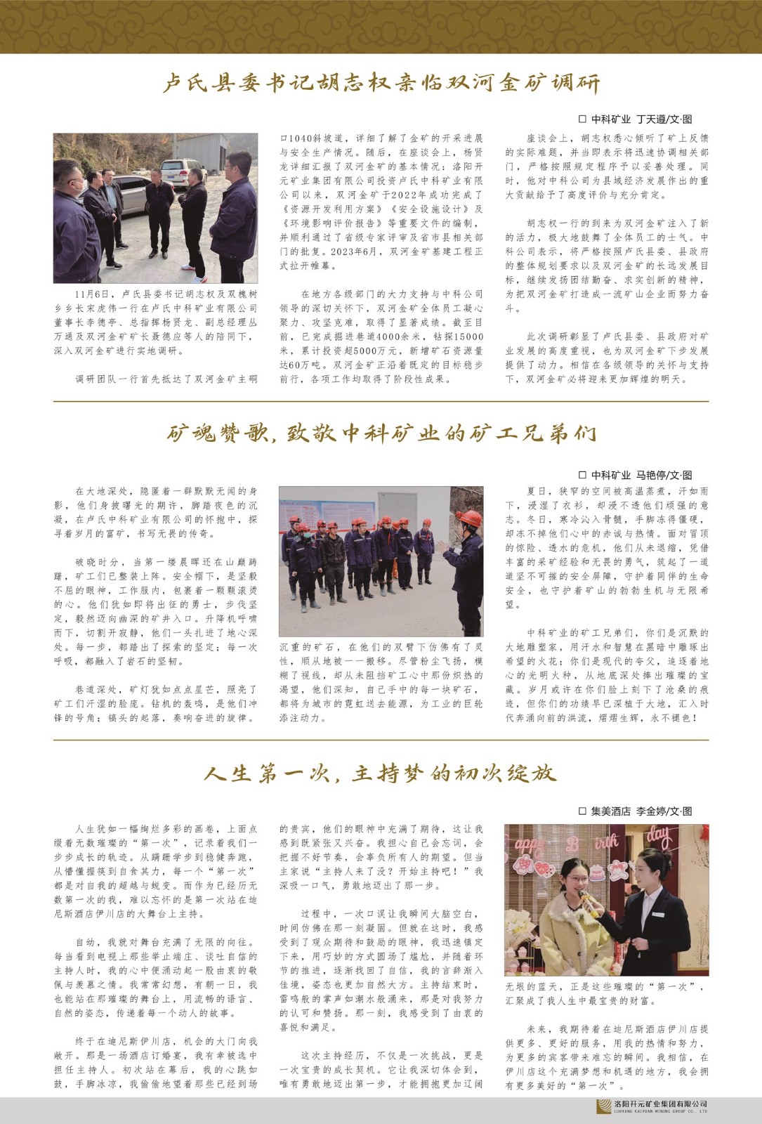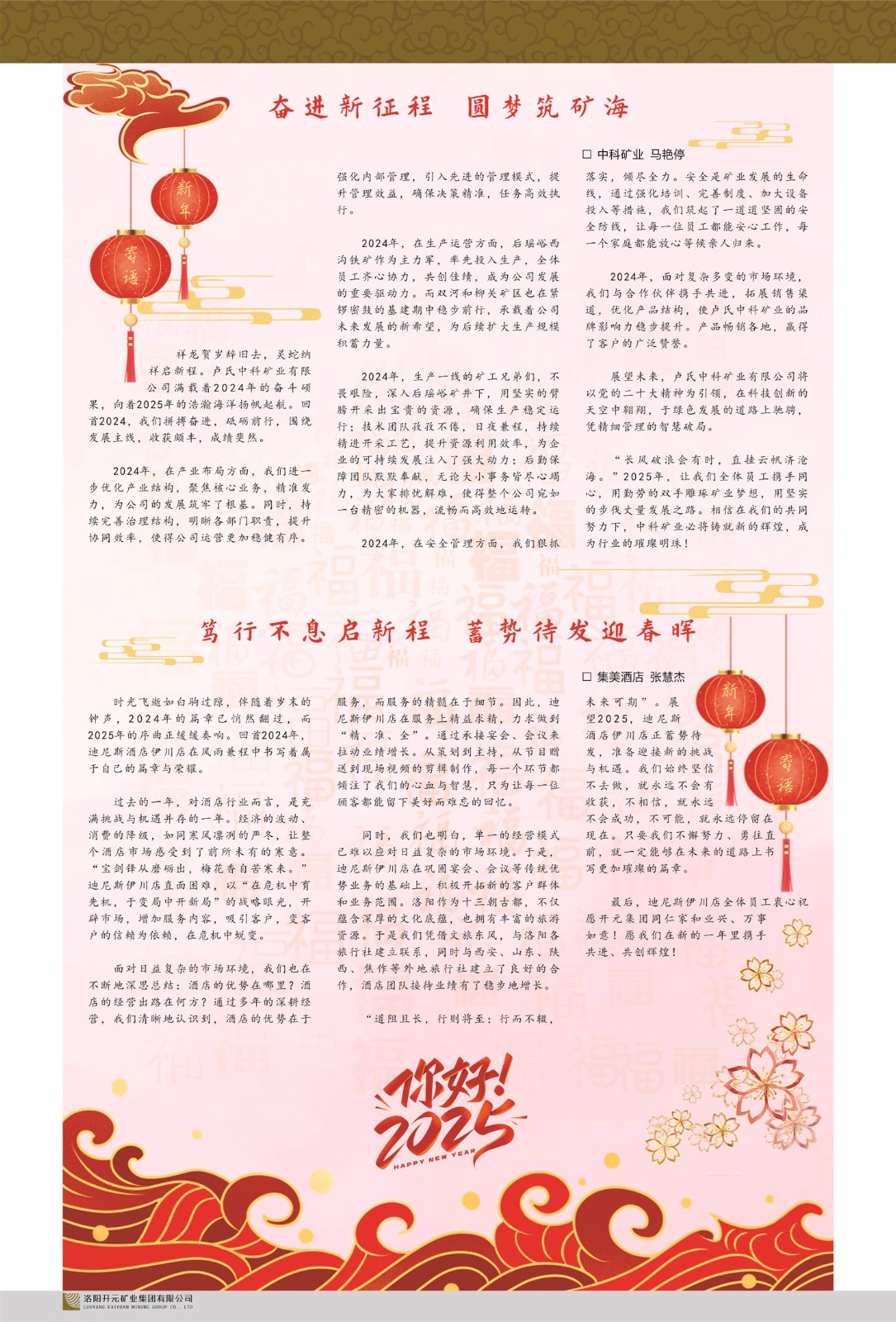 洛陽開元礦業(yè)集團(tuán)有限公司簡介洛陽開元礦業(yè)集團(tuán)有限公司,始成立于2006年,位于洛陽市開元大道269號。集團(tuán)旗下共有十余家全資子公司,業(yè)務(wù)涉及有色金屬礦山開發(fā)、礦產(chǎn)品購銷與進(jìn)出口貿(mào)易、房地產(chǎn)開發(fā)、文化藝術(shù)、企業(yè)管理與咨詢、資本投資等多個領(lǐng)域。2024年,集團(tuán)公司銷售總額達(dá)7.8億元。民建河南省委委員、民建河南省委企業(yè)委副主任、民建洛陽市委委員、企業(yè)委主任、洛陽民建企業(yè)家協(xié)會會長許明月是公司創(chuàng)始人,現(xiàn)任洛陽開元礦業(yè)集團(tuán)有限公司董事長。在礦業(yè)領(lǐng)域,洛陽開元礦業(yè)集團(tuán)擁有多家實(shí)力雄厚的子公司:貴州開元礦業(yè)有限公司探、采礦權(quán)面積共11.33平方公里;興??h銅鑫礦業(yè)有限公司探礦權(quán)面積8.76平方公里,礦山資源潛力巨大;2021年,開元集團(tuán)與盧氏中科礦業(yè)有限公司開展戰(zhàn)略合作。盧氏中科礦業(yè)有限公司專注于有色金屬的浮選、加工和銷售,擁有強(qiáng)大的技術(shù)支撐平臺,是集探、采、選、冶、研為一體的中大型綜合礦業(yè)企業(yè)。目前,盧氏中科王家河1000噸選礦廠已成功投產(chǎn),雙河金礦、柳關(guān)欒盧鉛鋅礦相繼順利開工,樓房銀礦與圪老灣鉛鋅礦的深部探礦重大突破,標(biāo)志著礦山版圖取得重大進(jìn)展,為開元集團(tuán)后續(xù)發(fā)展奠定了堅(jiān)實(shí)基礎(chǔ)。在文化傳媒領(lǐng)域,洛陽市明月美術(shù)館通過豐富多樣的藝術(shù)展覽、學(xué)術(shù)研討和公共教育活動,努力打造一個集展覽、交流、教育、研究為一體的綜合性藝術(shù)平臺。此外,在金融投資領(lǐng)域,開元集團(tuán)旗下的北京明峰資本管理有限公司專注于投資具有高增長潛力的優(yōu)秀企業(yè),特別是高科技、新能源、環(huán)保等新興產(chǎn)業(yè),為客戶提供個性化的資產(chǎn)配置服務(wù)。在做好企業(yè)經(jīng)營的同時,開元集團(tuán)始終不忘企業(yè)的社會責(zé)任和家國情懷,以突出的愛心公益事跡,開展了一系列公益慈善活動:“民建林”公益事業(yè)通過“思源基金”“幫幫公益”線上公益平臺,與眾多愛心人士籌措資金20余萬元;資助541名貧困大學(xué)生共計(jì)270余萬元,推進(jìn)“數(shù)字助力——河南AI人才培養(yǎng)”;捐款10萬元,馳援京津冀、黑龍江洪水地質(zhì)災(zāi)害……公司于2017年底被洛陽市慈善總會評為“洛陽慈善風(fēng)云榜——十大愛心集體”。洛陽開元礦業(yè)集團(tuán)有限公司秉承持續(xù)發(fā)展理念,憑借多年來良好的企業(yè)信譽(yù)與經(jīng)營業(yè)績,與全國多家企業(yè)建立了良好合作關(guān)系,受到社會各界的一致好評,多次榮獲“納稅標(biāo)兵”“先進(jìn)企業(yè)”“招商引資模范企業(yè)”等榮譽(yù)稱號?;赝麃頃r路,開元人勠力同心,以“闖”的精神和“創(chuàng)”的勁頭,一路披荊斬棘,踏過千山萬水;展望新未來,開元人凝心聚力,不執(zhí)于“舊”,無畏于“新”,秉承“勇于跨越,追求卓越”的企業(yè)精神,乘著國家高質(zhì)量發(fā)展新征程的東風(fēng),跨過高山,越過大海,向著集團(tuán)多元化、國際化的目標(biāo),逐夢遠(yuǎn)航,跨越前行!