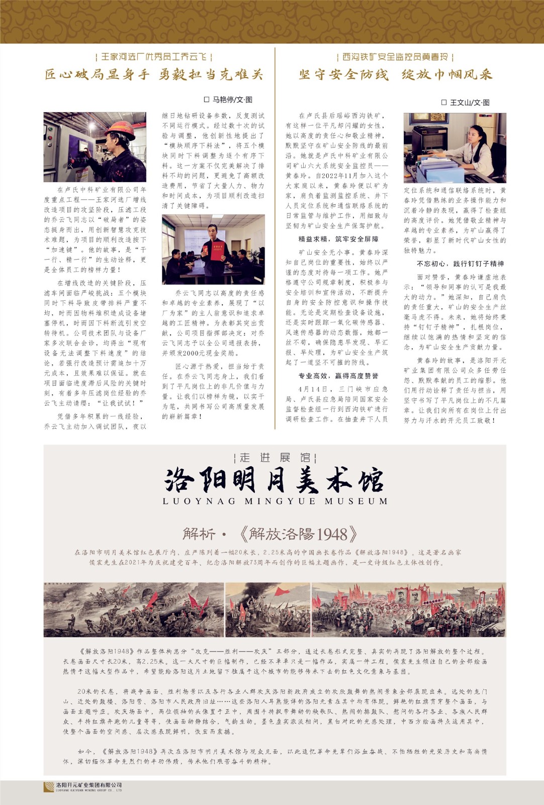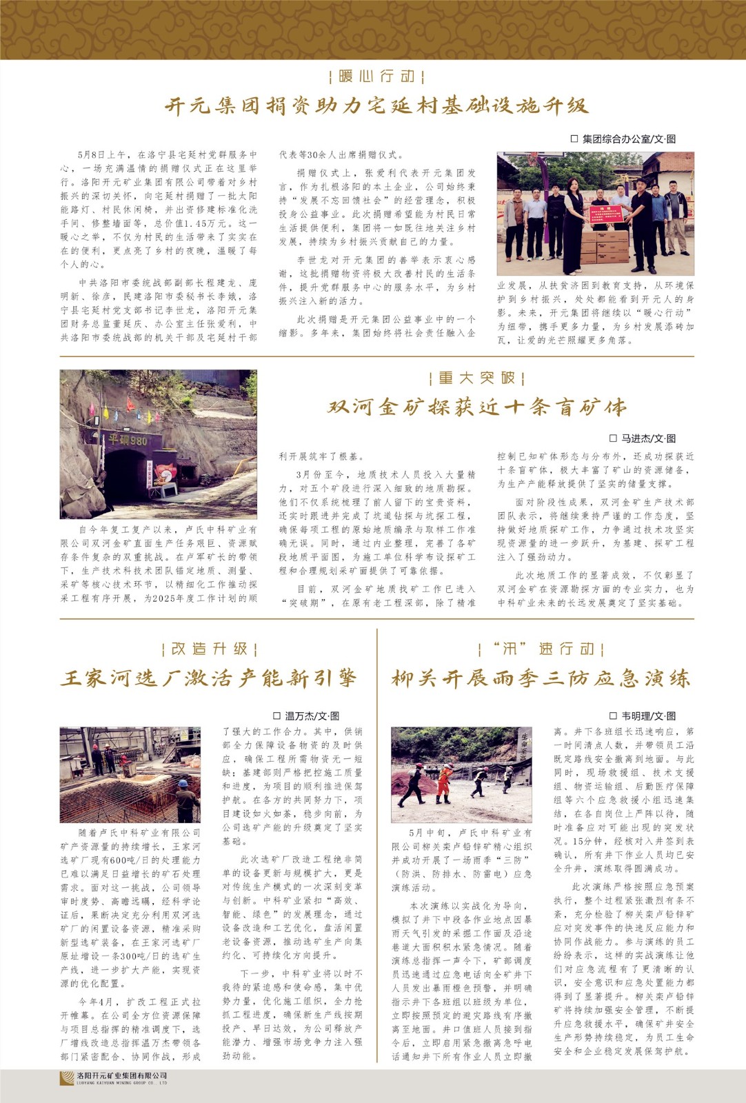 洛陽開元礦業(yè)集團有限公司簡介洛陽開元礦業(yè)集團有限公司,始成立于2006年,位于洛陽市開元大道269號。集團旗下共有十余家全資子公司,業(yè)務涉及有色金屬礦山開發(fā)、礦產品購銷與進出口貿易、房地產開發(fā)、文化藝術、企業(yè)管理與咨詢、資本投資等多個領域。2024年,集團公司銷售總額達7.8億元。民建河南省委委員、民建河南省委企業(yè)委副主任、民建洛陽市委委員、企業(yè)委主任、洛陽民建企業(yè)家協(xié)會會長許明月是公司創(chuàng)始人,現(xiàn)任洛陽開元礦業(yè)集團有限公司董事長。在礦業(yè)領域,洛陽開元礦業(yè)集團擁有多家實力雄厚的子公司:貴州開元礦業(yè)有限公司探、采礦權面積共11.33平方公里;興??h銅鑫礦業(yè)有限公司探礦權面積8.76平方公里,礦山資源潛力巨大;2021年,開元集團與盧氏中科礦業(yè)有限公司開展戰(zhàn)略合作。盧氏中科礦業(yè)有限公司專注于有色金屬的浮選、加工和銷售,擁有強大的技術支撐平臺,是集探、采、選、冶、研為一體的中大型綜合礦業(yè)企業(yè)。目前,盧氏中科王家河1000噸選礦廠已成功投產,雙河金礦、柳關欒盧鉛鋅礦相繼順利開工,樓房銀礦與圪老灣鉛鋅礦的深部探礦重大突破,標志著礦山版圖取得重大進展,為開元集團后續(xù)發(fā)展奠定了堅實基礎。在文化傳媒領域,洛陽市明月美術館通過豐富多樣的藝術展覽、學術研討和公共教育活動,努力打造一個集展覽、交流、教育、研究為一體的綜合性藝術平臺。此外,在金融投資領域,開元集團旗下的北京明峰資本管理有限公司專注于投資具有高增長潛力的優(yōu)秀企業(yè),特別是高科技、新能源、環(huán)保等新興產業(yè),為客戶提供個性化的資產配置服務。在做好企業(yè)經營的同時,開元集團始終不忘企業(yè)的社會責任和家國情懷,以突出的愛心公益事跡,開展了一系列公益慈善活動:“民建林”公益事業(yè)通過“思源基金”“幫幫公益”線上公益平臺,與眾多愛心人士籌措資金20余萬元;資助541名貧困大學生共計270余萬元,推進“數(shù)字助力——河南AI人才培養(yǎng)”;捐款10萬元,馳援京津冀、黑龍江洪水地質災害……公司于2017年底被洛陽市慈善總會評為“洛陽慈善風云榜——十大愛心集體”。洛陽開元礦業(yè)集團有限公司秉承持續(xù)發(fā)展理念,憑借多年來良好的企業(yè)信譽與經營業(yè)績,與全國多家企業(yè)建立了良好合作關系,受到社會各界的一致好評,多次榮獲“納稅標兵”“先進企業(yè)”“招商引資模范企業(yè)”等榮譽稱號?;赝麃頃r路,開元人勠力同心,以“闖”的精神和“創(chuàng)”的勁頭,一路披荊斬棘,踏過千山萬水;展望新未來,開元人凝心聚力,不執(zhí)于“舊”,無畏于“新”,秉承“勇于跨越,追求卓越”的企業(yè)精神,乘著國家高質量發(fā)展新征程的東風,跨過高山,越過大海,向著集團多元化、國際化的目標,逐夢遠航,跨越前行!